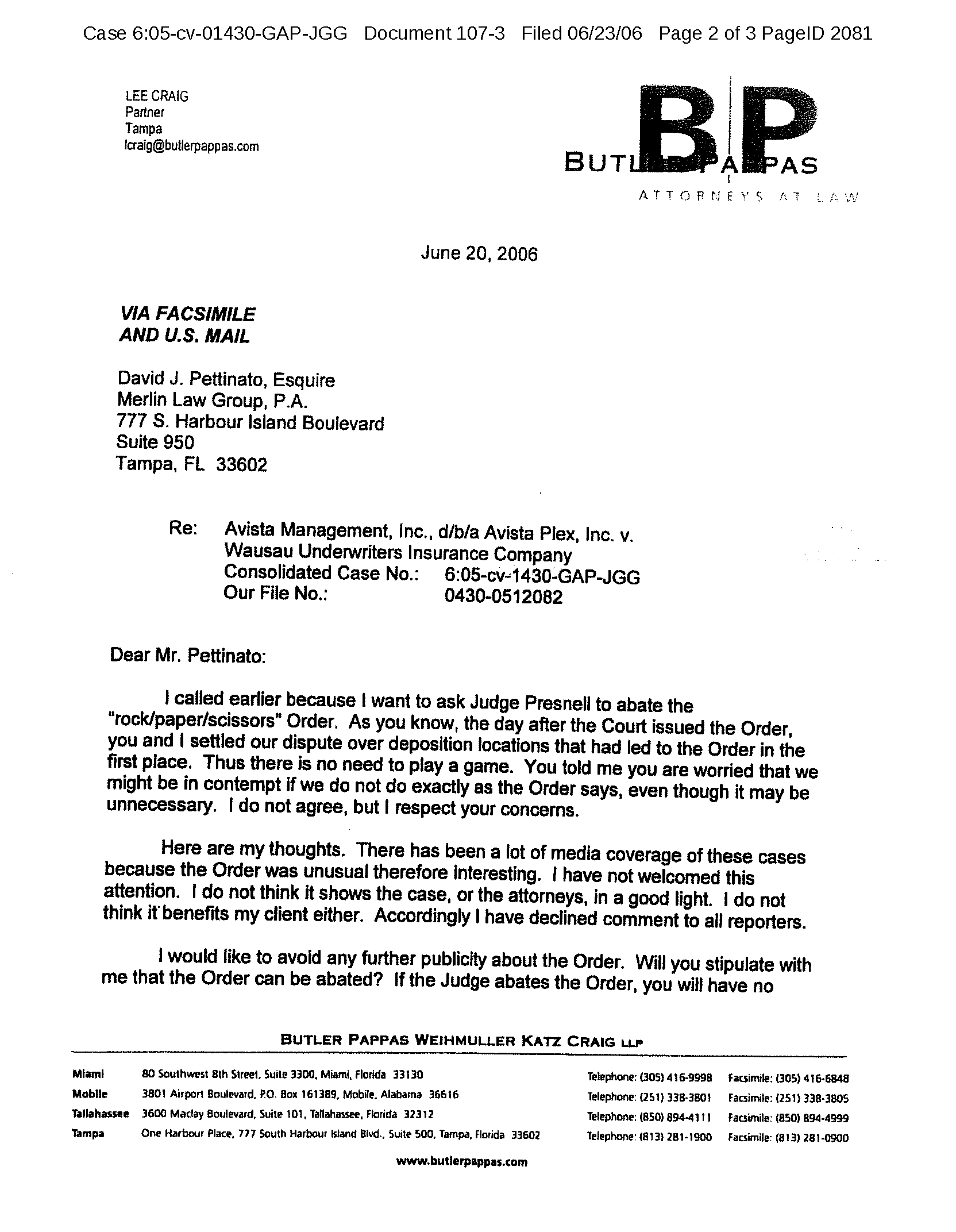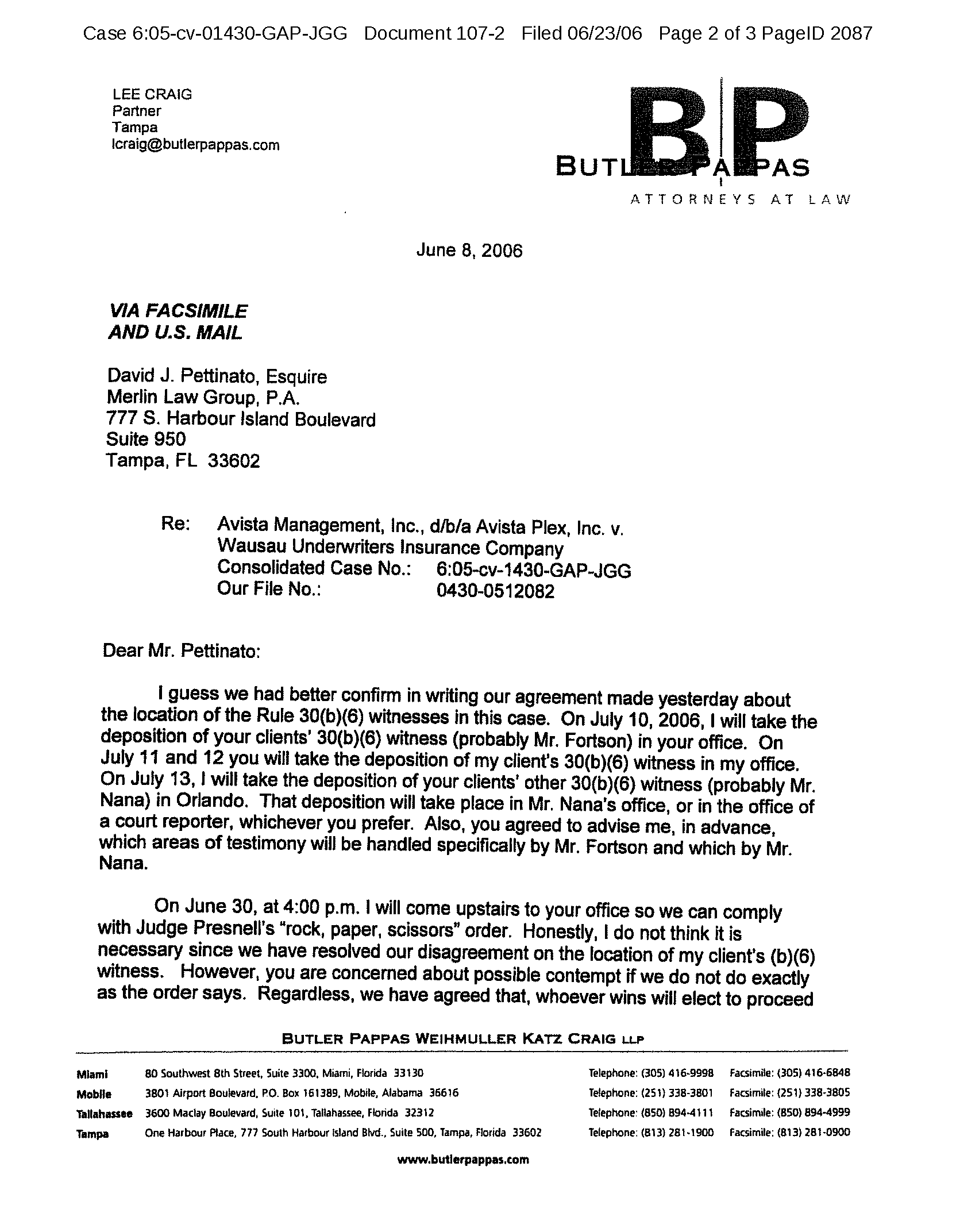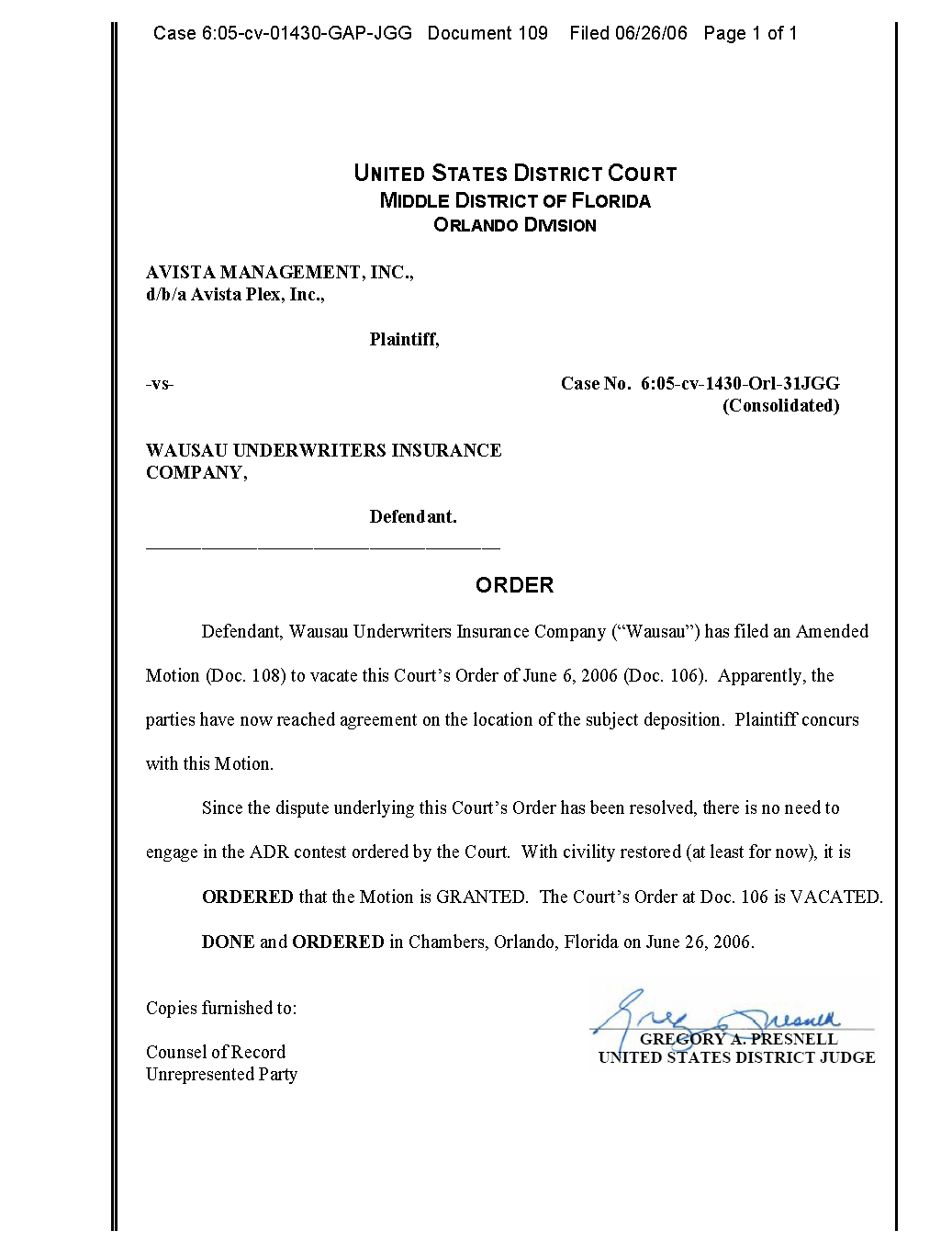 Two days after Judge Presnell entered the order above (Section 2.1.4), counsel for defendant Wausau Underwriters Insurance Co. wrote to counsel for plaintiff Avista Management, Inc.