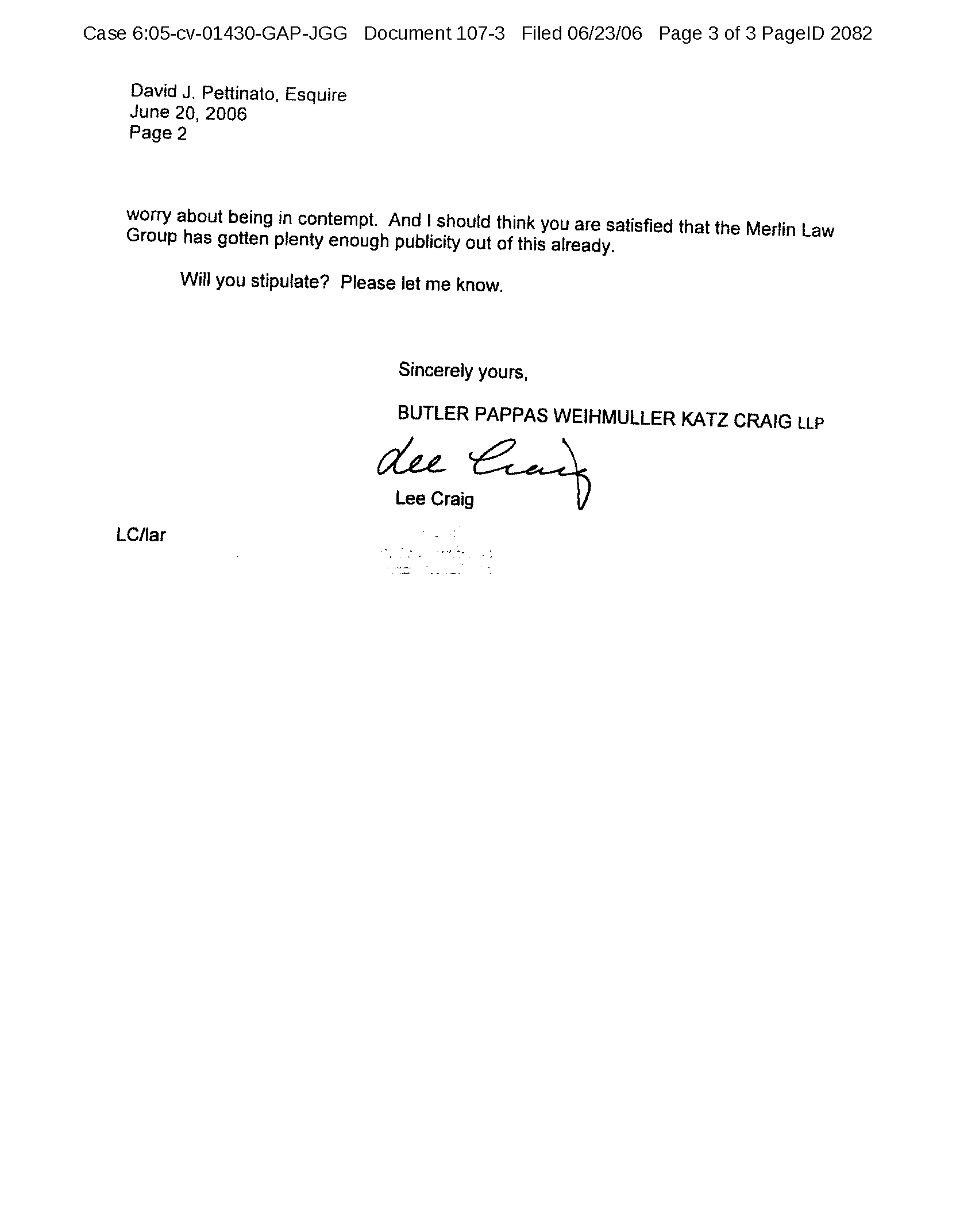 Several days later, Mr. Craig again wrote to Mr. Pettinato.